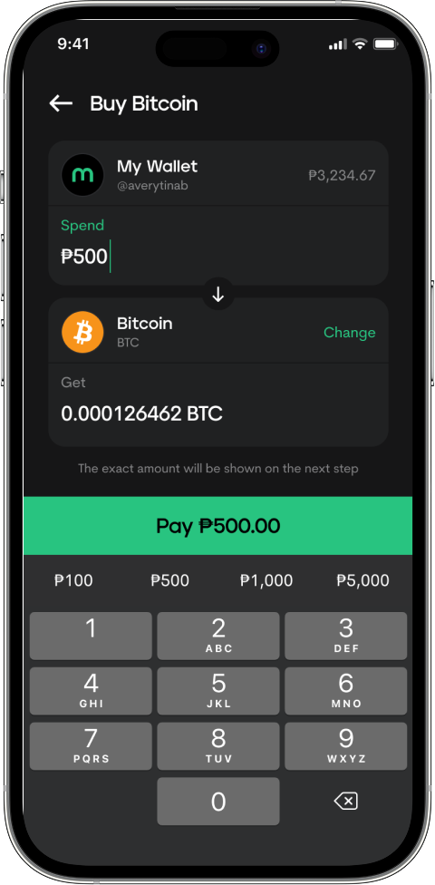 Enter the amount, tap Pay, and confirm your buy order