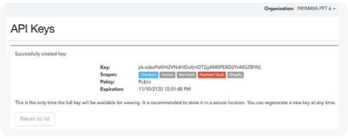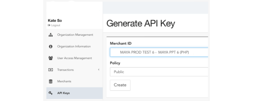 1. Under the API Keys section on your Maya Manager dashboard, generate a set of keys for your store. You’ll need one PUBLIC and one SECRET key.